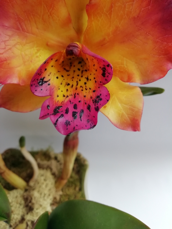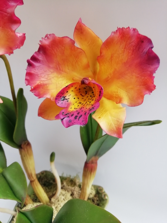 Narancs színű, dupla virágú Cattleya orchidea, olivazöld színű, szögletes formájú, rusztikus kaspóban.